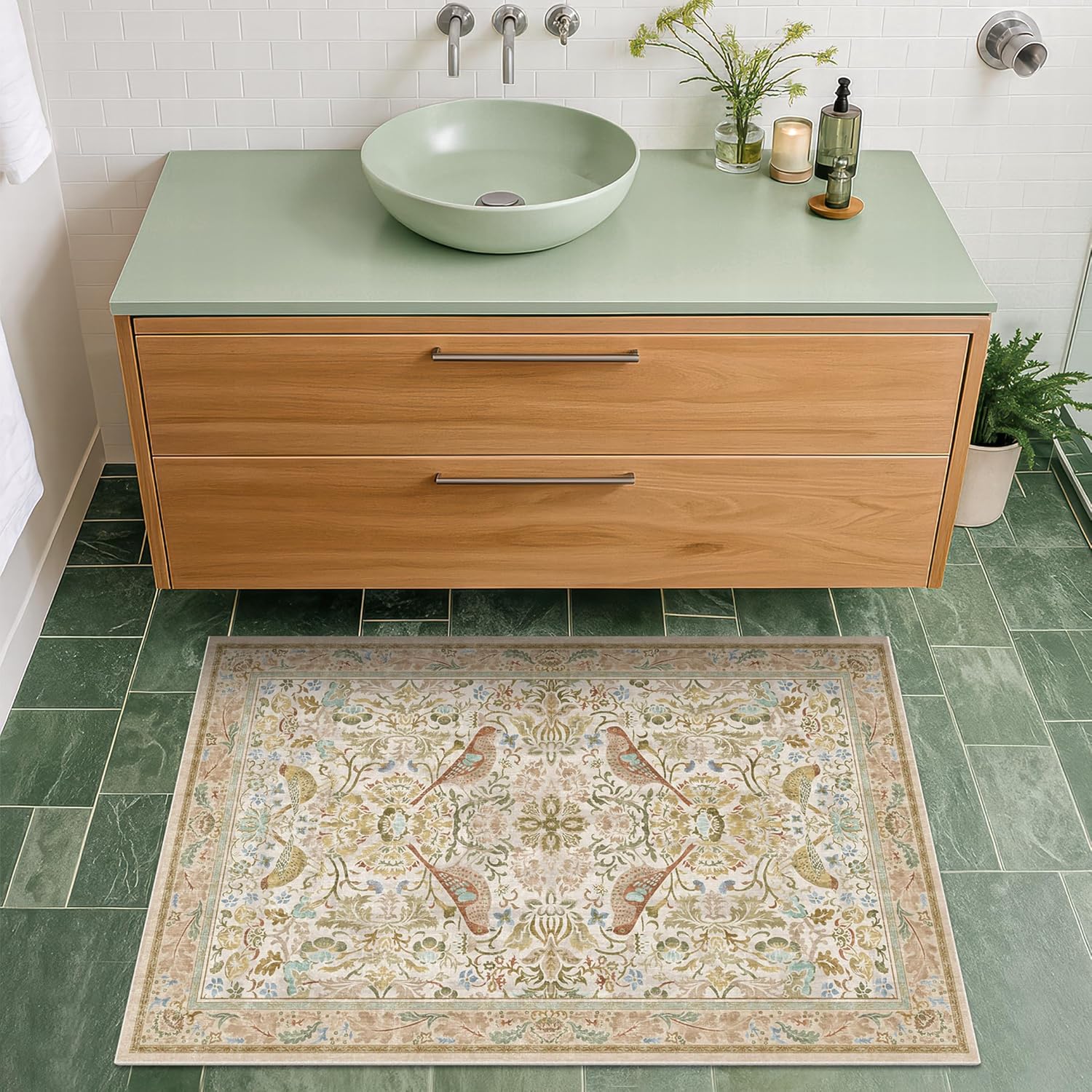 Washable Area Rugs 5x8 for Bedroom - Western Plant Rugs for Living Room, Dinning Room, Home Office, Playroom with Boho Light Green Botanical & Bird Pattern, Non Slip Stain Resistant Low Pile